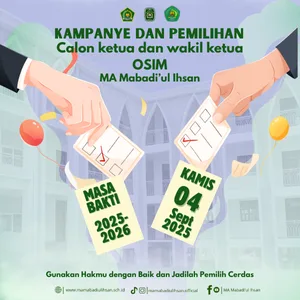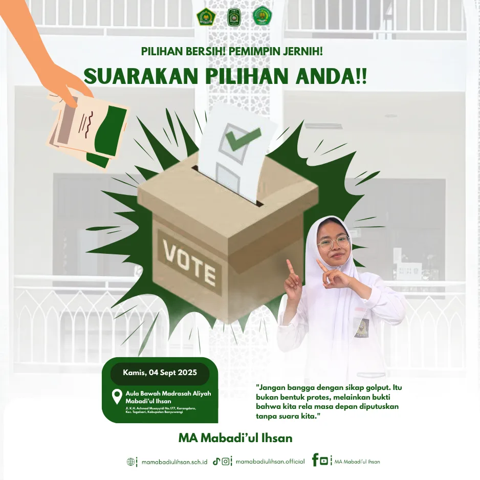 Suarakan pilihan anda untuk pemimpin jernih OSIM MA Mabadi’ul Ihsan. MA Mabadi’ul Ihsan kamis, 4 September, 2025. Melaksanakan pemilu Raya yang dilaksanakan di selatan gedung