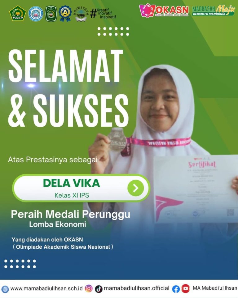 Siswi MA Mabadi’ul Ihsan, Dela Vika Khoirunnisa, baru saja menorehkan prestasi gemilang dengan meraih medali perunggu dalam OKASN (Olimpiade Akademik Siswa Nasional) 2025 yang diselenggarakan pada 18 Mei 2025. Bersaing dengan ratusan siswa terbaik se-Indonesia, Dela membuktikan bahwa talenta dan kerja keras tak kenal batas!