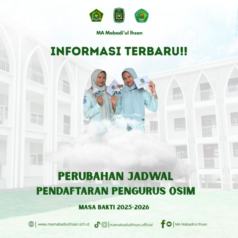 MA Mabadi’ul Ihsan secara resmi membuka pendaftaran OSIM (Organisasi Siswa Intra Madrasah) mencakup Ketua, Wakil Ketua, serta Anggota OSIM untuk Periode 2025/2026.