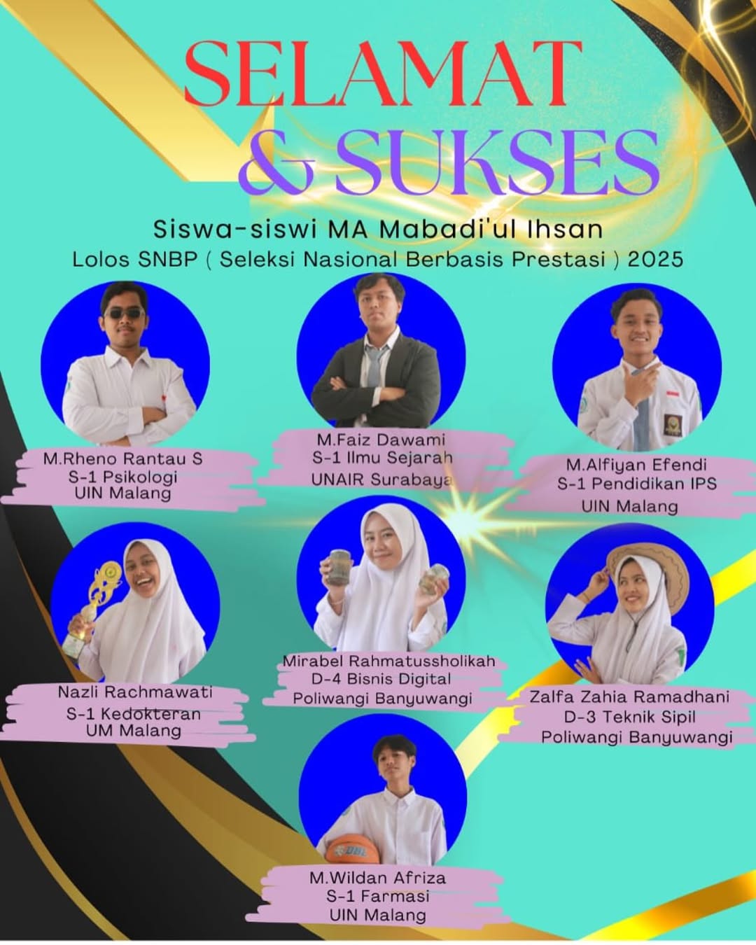 📢 KABAR GEMBIRA Pada Selasa, 18 Maret 2025, MA Mabadi’ul Ihsan kembali menorehkan prestasi membanggakan dengan 7 siswa berhasil lolos SNBP 2025, seleksi nasional berbasis prestasi untuk