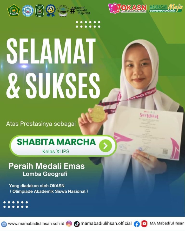 Pada 11 Mei 2025, Shabita Marcha Tuan Aurellia, siswi kelas XI IPS MA Mabadi’ul Ihsan, berhasil mengharumkan nama sekolah dengan meraih medali emas dalam Lomba Geografi OKASN 2025. Kompetisi bergengsi tingkat nasional ini diikuti oleh 250 peserta terbaik se-Indonesia dan dilaksanakan secara daring via laptop di kantor MA Mabadi’ul Ihsan.